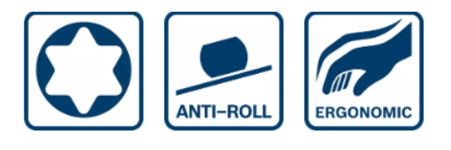 มีการระบุขนาดไว้ที่ด้ามเพื่อให้เลือกขนาดไขควงขนาดที่ถูกต้องได้อย่างรวดเร็ว ก้านยาว 75 มม. ขนาดอื่นๆ ที่มีจำหน่าย: TX10 x 75 มม., TX15 x 75 มม., TX20 x 100 มม., TX25 x 100 มม., TX30 x 125 มม.