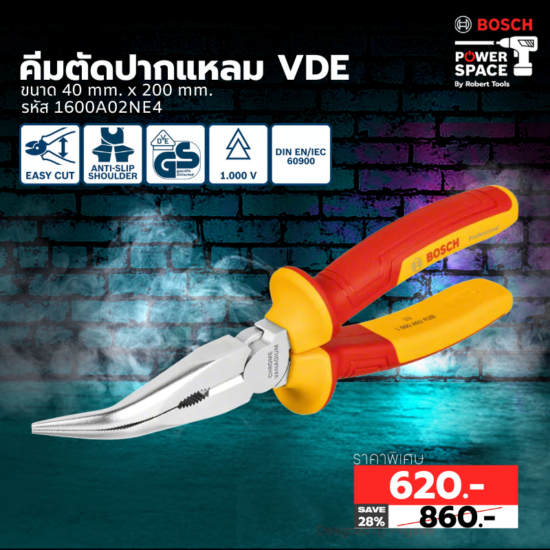Bosch - รุ่น 1600A02NE4 คีมตัดปากแหลมงอกันไฟ 40° VDE 200 มม. VDE Long Nose Plier bent (40°) 200mm รหัส 1600A02NE4