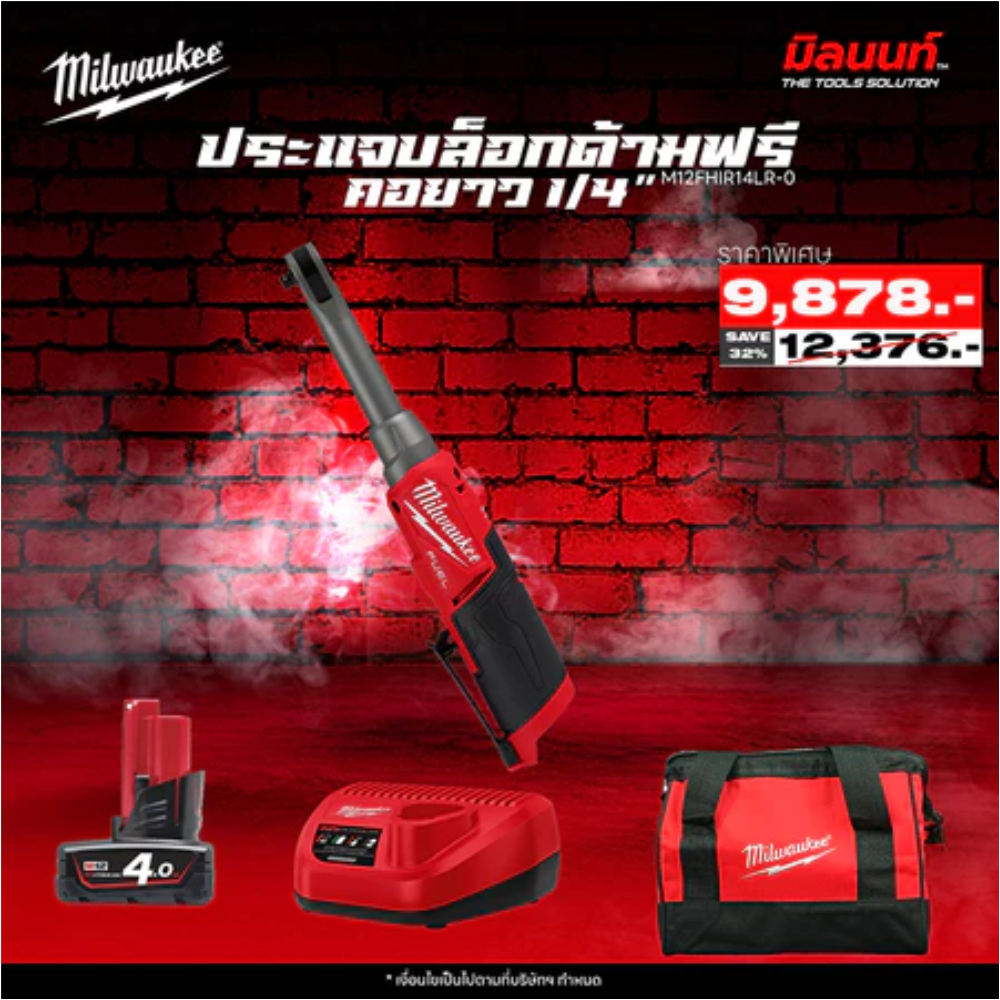 คุณสมบัติ - 1. Milwaukee - M12 FHIR14LR-0 ประแจบล็อกด้ามฟรีไร้สายคอยาว 12 โวลต์ 1/4" พร้อมแบตและแท่นชาร์จ