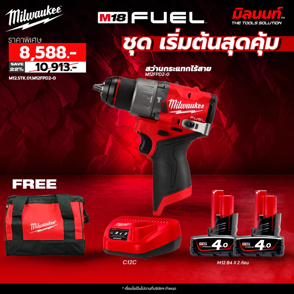 Milwaukee ชุดเริ่มต้นสุดคุ้ม สว่านกระแทกไร้สาย M12FPD2-0 พร้อมแบตเตอรี่และแท่นชาร์จ