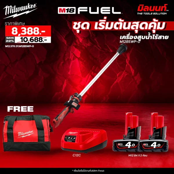 Milwaukee - M12 ชุดเริ่มต้นสุดคุ้ม เครื่องสูบน้ำไร้สาย M12BSWP-0 พร้อมแบตเตอรี่และแท่นชาร์จ