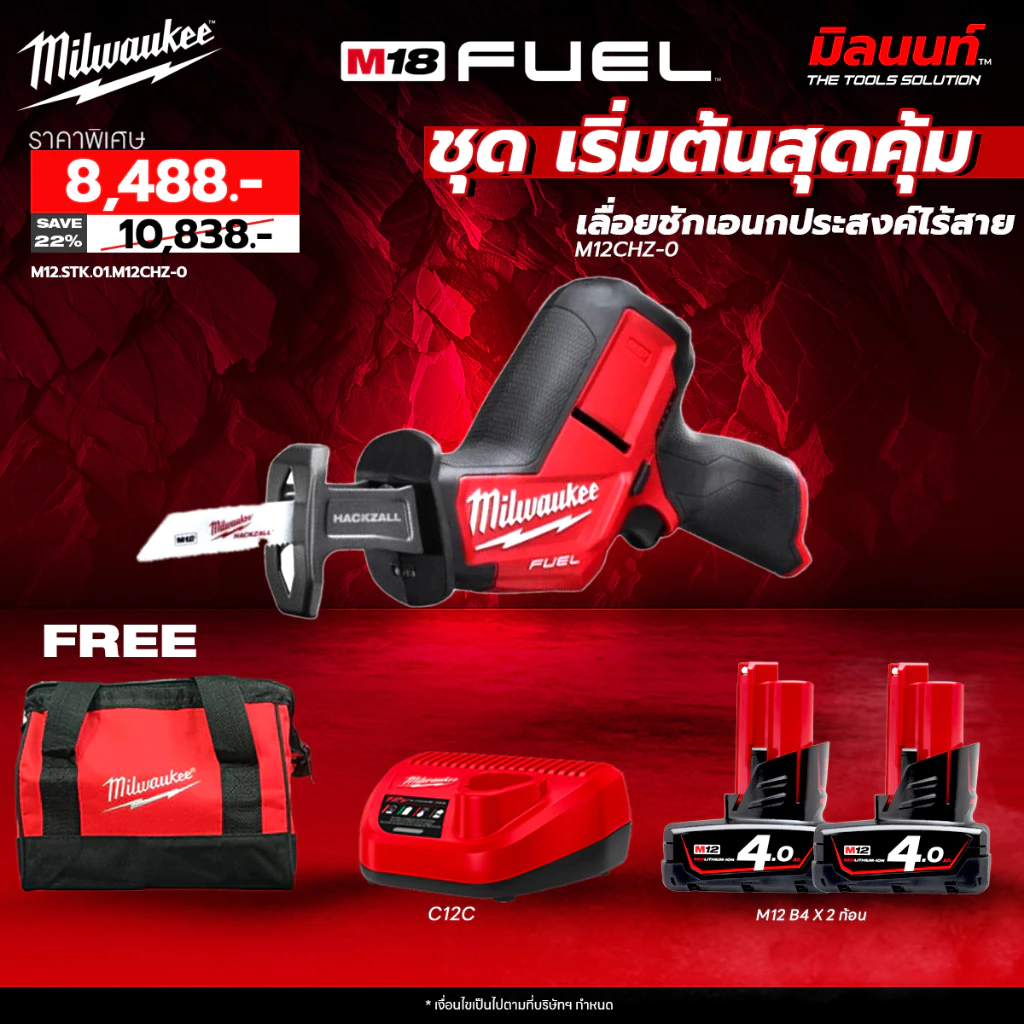Milwaukee ชุดเริ่มต้นสุดคุ้ม เลื่อยชักเอนกประสงค์ไร้สาย M12 CHZ-0 พร้อมแบตเตอรี่และแท่นชาร์จ