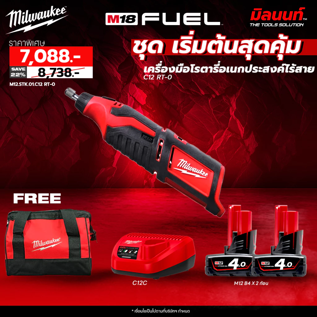 Milwaukee ชุดเริ่มต้นสุดคุ้ม เครื่องมือโรตารี่อเนกประสงค์ไร้สาย C12 RT-0 พร้อมแบตเตอรี่และแท่นชาร์จ