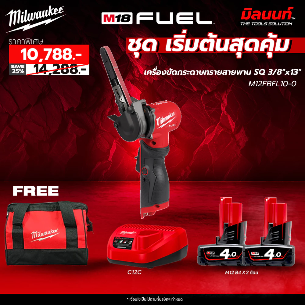 Milwaukee - M12 ชุดเริ่มต้นสุดคุ้ม เครื่องขัดกระดาษทรายสายพาน M12FBFL10-0 พร้อมแบตเตอรี่และแท่นชาร์จ