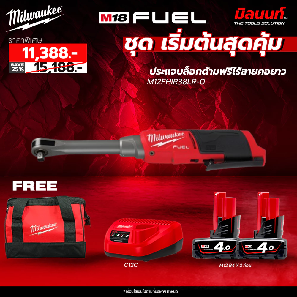 Milwaukee - M12 ชุดเริ่มต้นสุดคุ้ม ประแจบล็อกด้ามฟรีไร้สายคอยาว M12FHIR38LR-0 พร้อมแบตเตอรี่และแท่นชาร์จ