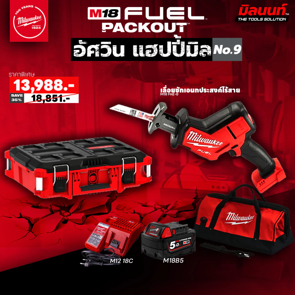 Milwaukee - ชุดอัศวิน แฮปปี้มิล เลื่อยชักเอนกประสงค์ + กล่องเครื่องมือของ PACKOUT™ (พร้อมแบตและแท่นชาร์จ)