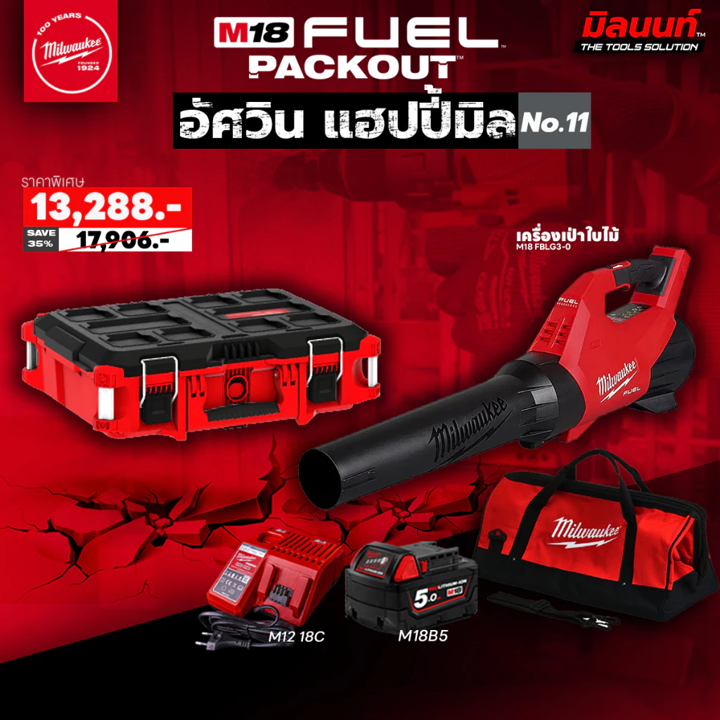 Milwaukee - ชุดอัศวิน แฮปปี้มิล เครื่องเป่าใบไม้ + กล่องเครื่องมือของ PACKOUT™ (พร้อมแบตและแท่นชาร์จ)