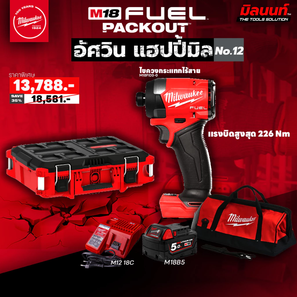 คุณสมบัติ - 1. Milwaukee ไขควงกระแทกไร้สาย 18 โวลต์ รุ่น M18FID3-0 (เครื่องเปล่า)