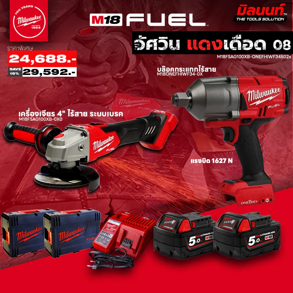 MILWAUKEE อัศวินแดงเดือด 08 เครื่องเจียร 4" ไร้สาย ระบบเบรค M18FSAG100XB + บล๊อคกระแทกไร้สาย M18ONEFHIWF34 พร้อมใช้งาน
