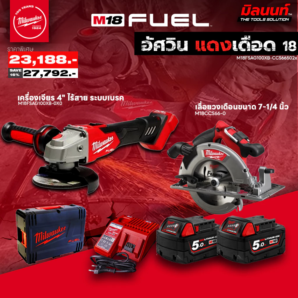 MILWAUKEE อัศวินแดงเดือด 18 เครื่องเจียร 4" ระบบเบรค M18FSAG100XB + เลื่อยวงเดือนขนาด 7-1/4 นิ้ว (190 มม.) M18CCS66-0
