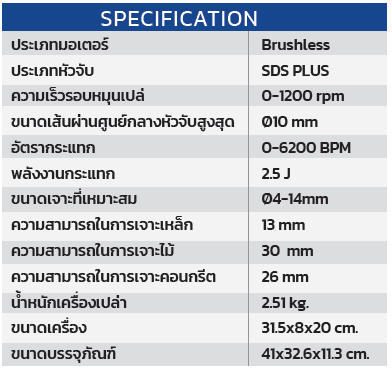 • พลังกระแทก 2.5 จูลมอเตอร์ไร้แปรงถ่านประสิทธิภาพสูง