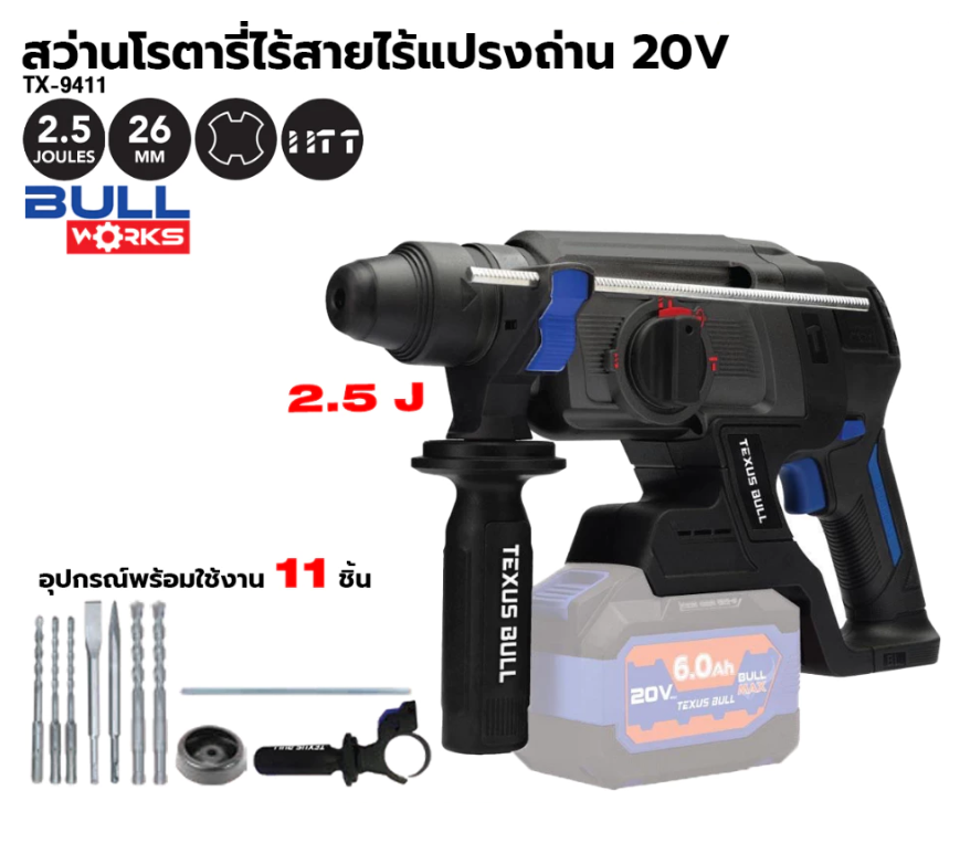 TEXUS BULL รุ่น TX-9411 สว่านโรตารี่ไร้สาย 20V.อุปกรณ์11ชิ้น (เครื่องเปล่า)