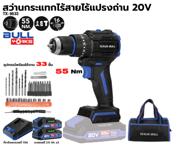 TEXUS BULL รุ่น TX-9633 สว่านกระแทกไร้สาย 20V. อุปกรณ์33ชิ้น พร้อมแบตเตอรี่ x2.0Ah 2ก้อน