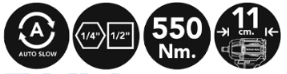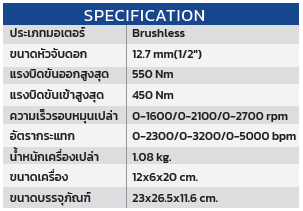 - แรงบิดขันออก 550 NM. /ขันเข้า 450 NM. มอเตอร์ไร้แปรงถ่านประสิทธิภาพสูง ไม่สึกหรอง่าย