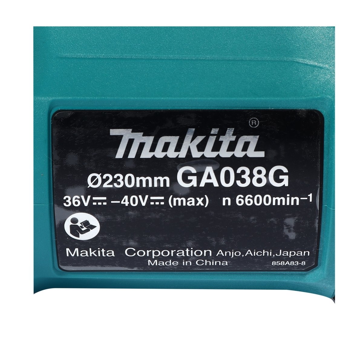 MAKITA รุ่น GA038GZ เครื่องเจียไร้สาย 40 Vmax ขนาด 9 นิ้ว ความเร็วรอบตัวเปล่า 6,600 รอบ/นาที (เครื่องเปล่า)