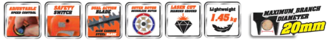- ใบมีดและบาร์ผลิตจากเหล็กกล้าคาร์บอนสูง พร้อมสกรูยึดจับด้านบนบาร์ เพื่อเพิ่มความแข็งแรงมั่นคงและปลอดภัยมากขึ้น